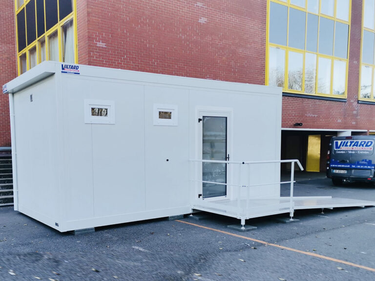 Sanitaire Avion 62210 18m2 Le modulaire WC PMR est conçu pour répondre à toutes les exigences d’accès et de mouvement d’une personne à mobilité réduite. Il dispose d’un équipement complet avec : rampe d’accès, palier en aluminium antidérapant, sanitaires…